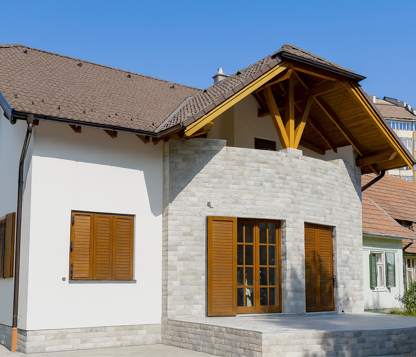 Situată în zona centrală a orașului, clădirea “B” este un exemplu minunat de îmbinare între arhitectura modernă și rigorile zonei. Aici ferestrele și ușile din lemn de molid lăcuite natur s-au încadrat cu succes în abordarea modernă a design-ului propus și a oferit locuitorilor clădirii oportunitatea de a se simți mai aproape de natură chiar în mijlocul orașului.